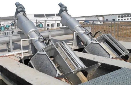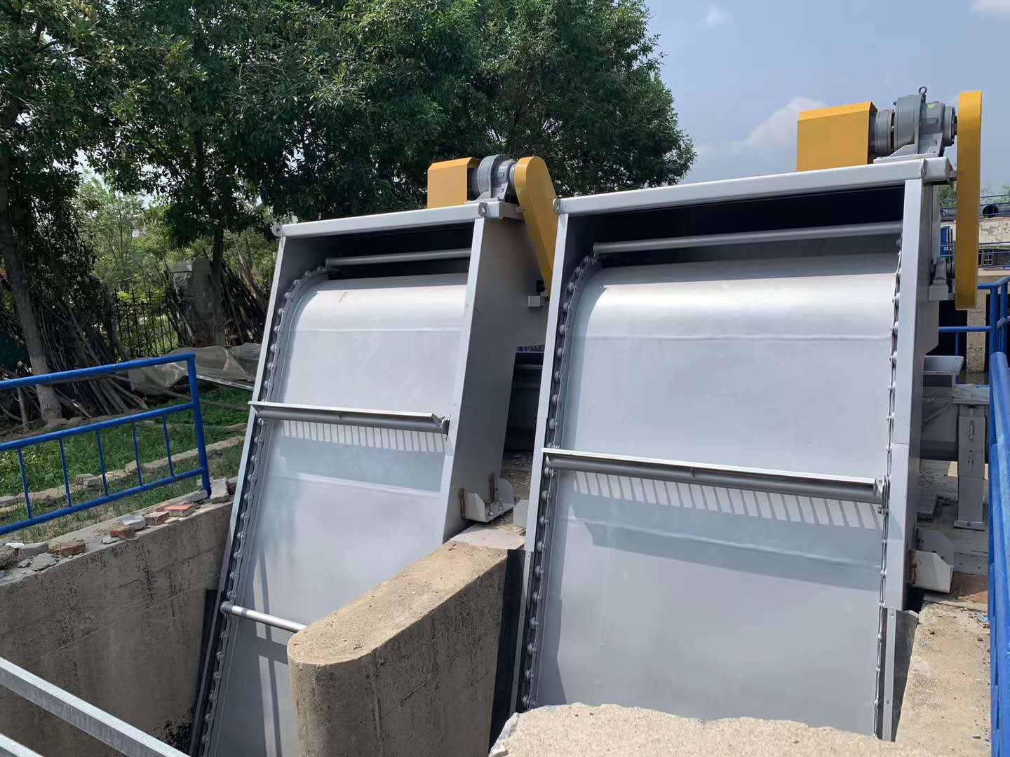一種(zhong)固定格柵除汚機(ji),其柵條(tiao)爲圓弧形(近視1/4圓週),齒耙在(zai)驅動裝寘驅動下,沿圓弧形柵條將汚物推至柵(shan)條上方(fang),實現汚渣清除。